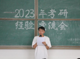 四位考研成功学生代表范天石、姜小婧、陈兰旭和崔一博先后发言,从学校和专业选择、时间规划、心态调整、复试调剂等方面,分享了自己的成功经验,并向备考学生推荐了优秀学习资料,公开了学习笔记。
