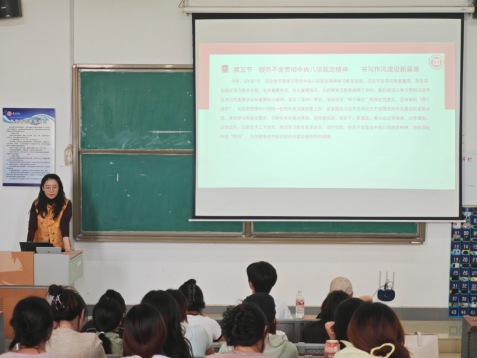 4月17日,学院党委宣传委员张丽嫱以《锲而不舍贯彻中央八项规定精神,书写作风建设新篇章》为题,围绕中央八项规定出台背景、具体内容以及重要意义展开讲解,详细解读了“中央八项规定”和“中央八项规定精神”之间的区别与联系,在阐释中央八项规定的核心内容时,深入阐述了在推进党风廉政建设中的关键作用,希望大家能不断增强纪律意识、规矩意识,把纪律规矩刻印在心,知敬畏、存戒惧、守底线,使铁的纪律真正转化为日常习惯和自觉遵循。