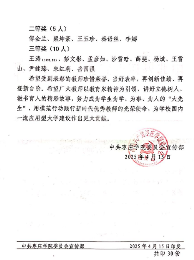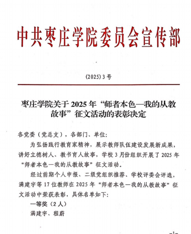 近日,枣庄学院举办“我的从教故事”征文活动,我院教师满建宇老师作品荣获一等奖,傅金兰老师作品荣获二等奖。