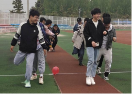 第三项“心心相印(背夹球)”,每组2人,背夹一气球,步调一致向前走。该游戏旨在提高学员间的默契度,培养学员相互关爱、相互信任的优良品格。