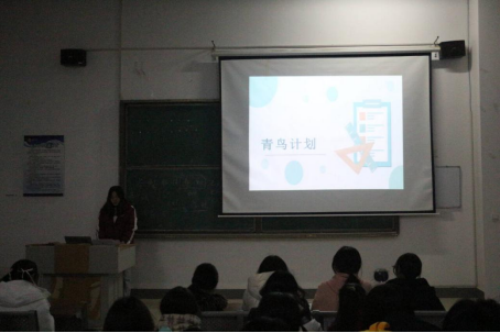 会上,董夏凡、邢梦瑶等四位同学现场依次分享经验,畅谈实践收获,介绍了“青鸟计划”的含义,并讲解了如何参与“青鸟计划”及其注意事项,并展示了他们参与青鸟计划时的图片,如参加义教,进入银行工作,进行经济普查等工作。内容生动、情感真挚,展示了新时代青年积极进取、心系家乡的精神风貌和浓厚乡情。他们通过参加“青鸟计划”从而走向社会,接触社会,了解社会,还从生活和实践中学到新知识,不断地从各方面武装自己。