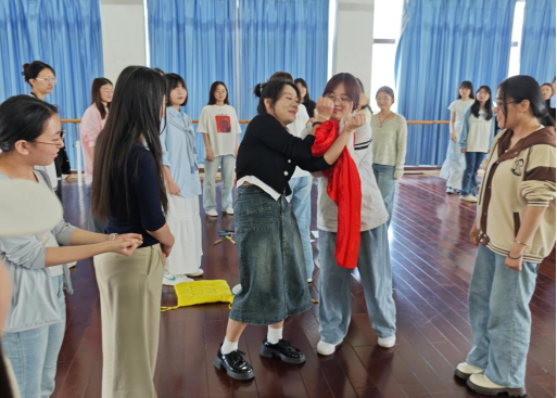 接下来的《信仰之链》环节中,一条红色绸布成为全场焦点。同学们依次用身体传递这条象征信仰与革命精神的红绸布,既考验协作能力,也象征精神薪火的传承。全体成员接力完成,形成一条延绵不断的“红色信仰链”,寓意红色精神在新时代青年中不断传递、生生不息。