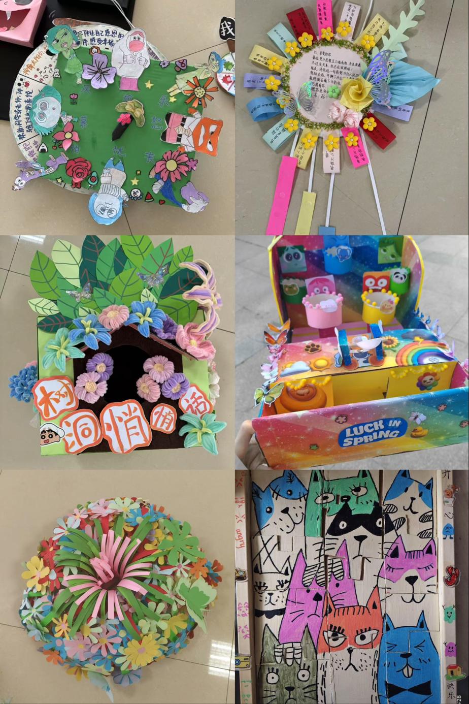 本次比赛鼓励学生以纸艺、布艺、木艺等多种手工形式自由创作,作品内容涵盖情绪转盘、感统训练道具、墙面互动游戏、减压宣泄工具等,既注重实用性,又体现美观性与艺术感。