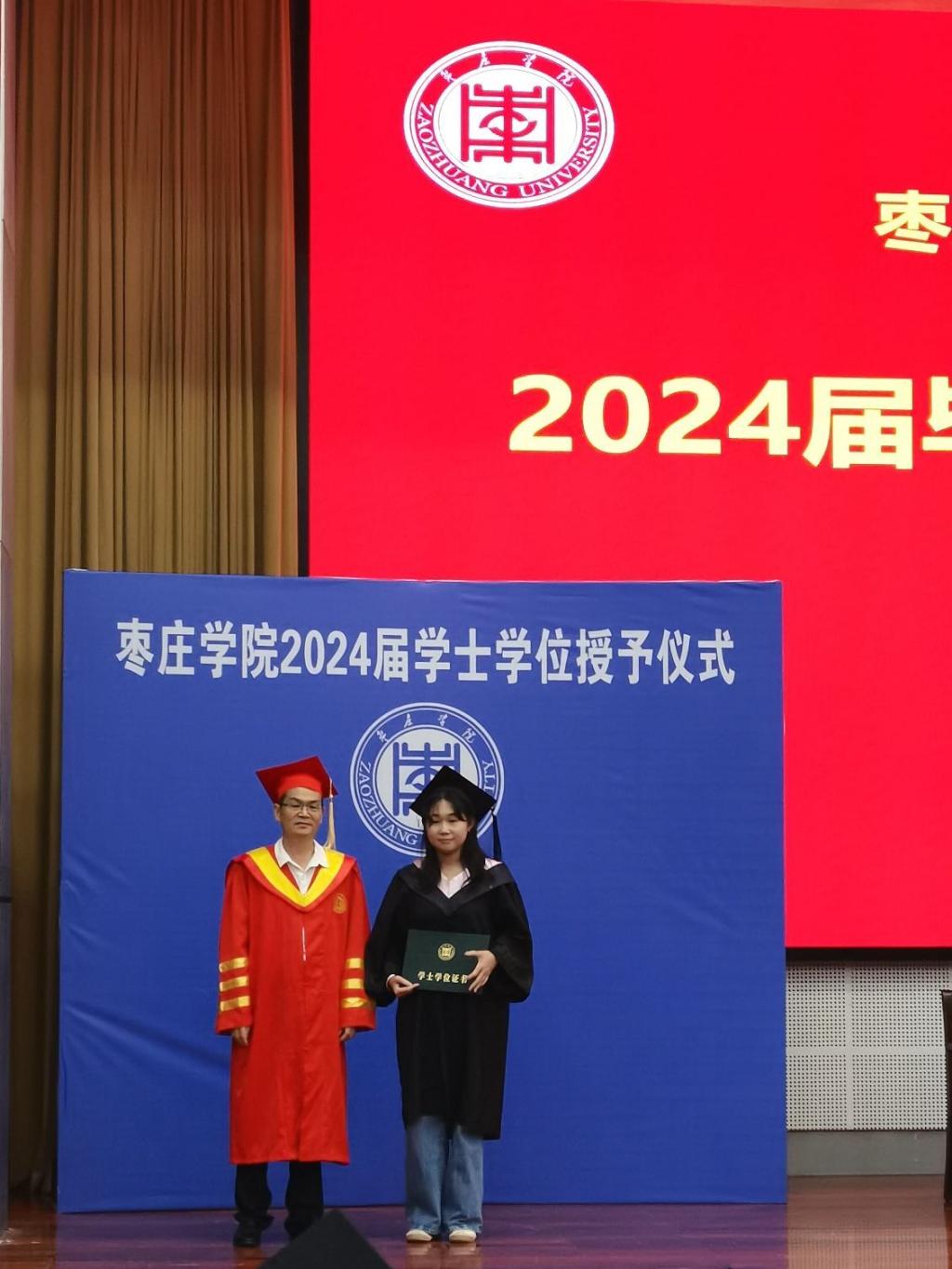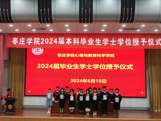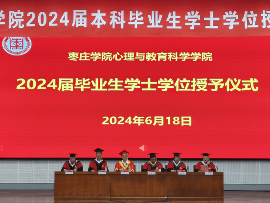 典礼前,播放了学院制作的毕业视频《就在盛夏告别吧》。下午3:00,典礼在庄严的国歌声中拉开帷幕。随后,院长傅金兰宣读了《关于授予2024届毕业生学士学位的决定》,同意授予谢旭岩等329名普通全日制本科毕业生学士学位。典礼上,校党委委员、纪委书记、省监委驻枣庄学院监察专员武尚民依次为毕业生拨穗正冠、颁发学士学位证书,全体领导为2024届校友联络员代表颁发聘书。