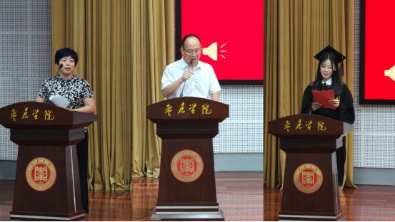 满建宇代表全体教师对即将走出校园的毕业生送上期盼和祝福,希望同学们心怀梦想,牢固树立报国之志,奉献青春和热血,用自己的成绩和收获为母校增光添彩。学生吕雅杰母亲作为家长代表,向为同学们成长倾注爱心、汗水和智慧的领导和老师们表示感谢,希望同学不断充实自我,书写精彩的人生篇章,祝福枣院桃李满天下,再谱华章。毕业生代表蓝云翔同学发言,抒发了对母校、对老师、对同学的感激和留恋之情,表达了勇担时代重任、展现青春作为的信心和决心,向母校献上真挚美好的祝福。