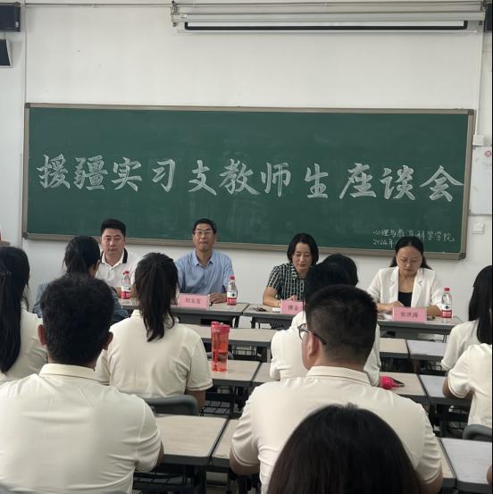 座谈会上,党委书记刘玉宝指出援疆支教工作是一项重要的政治任务,是为学校深化构建“大思政”育人格局和“五育并举”人才培养模式提供了有力支撑,对学生提出了三点要求:一要坚定正确的政治方向,秉承着“兼爱、尚贤、博物、戴行”校训,要用实际行动践行着“到祖国和人民最需要的地方去”的庄严承诺;二要坚决维护国家统一和民族团结,融入当地,服从管理,安全第一;三要肩负起教书育人的使命与担当,厚植情怀,增强本领,扎实工作,高标准高质量完成援疆任务。
