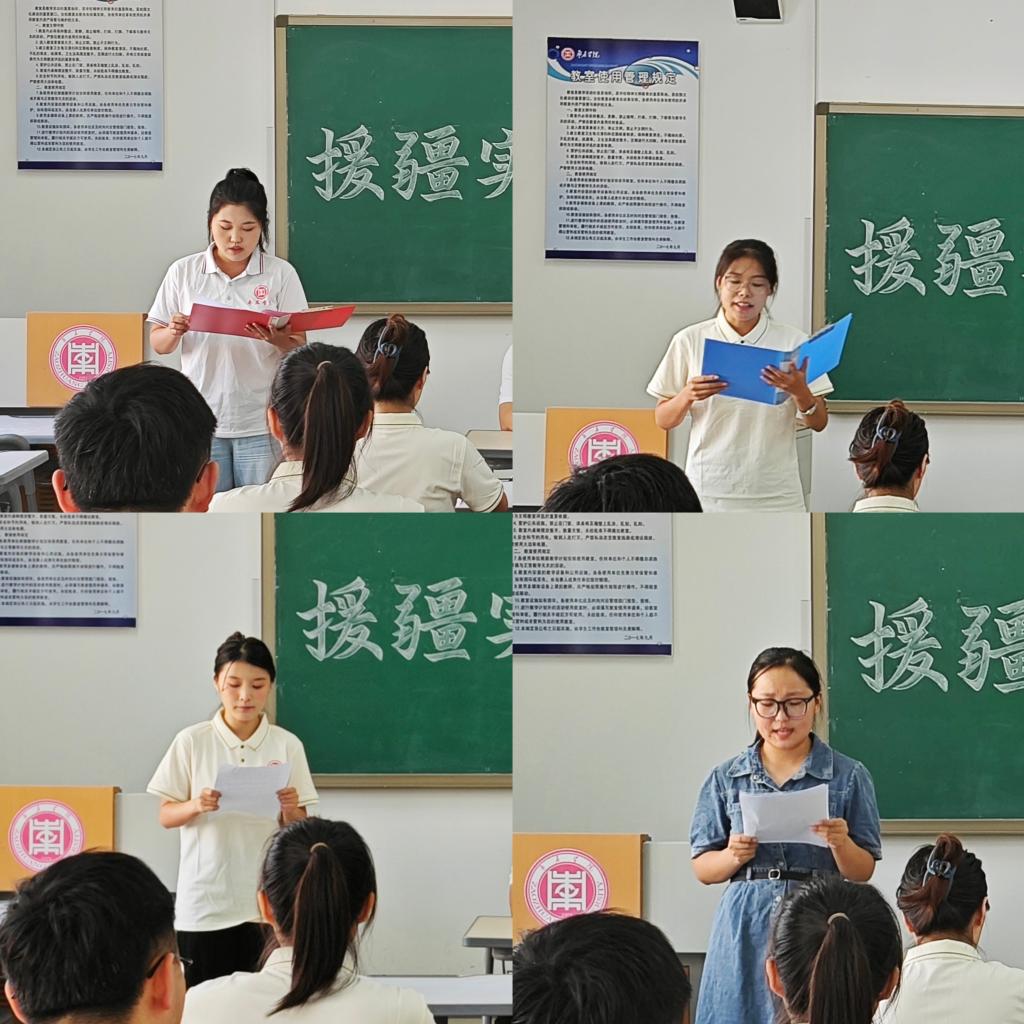 春季援疆支教学生代表徐子娇和滕静分别从教学工作、志愿服务活动及团队建设等方面进行了汇报。本次支教学生代表王晓钰和钟雨婷作表态发言,表示将继承发扬好历届支教团优良作风,以高度的政治责任感开展援疆实习支教工作,以实际育人成果促进民族团结,保证圆满完成援疆支教任务。