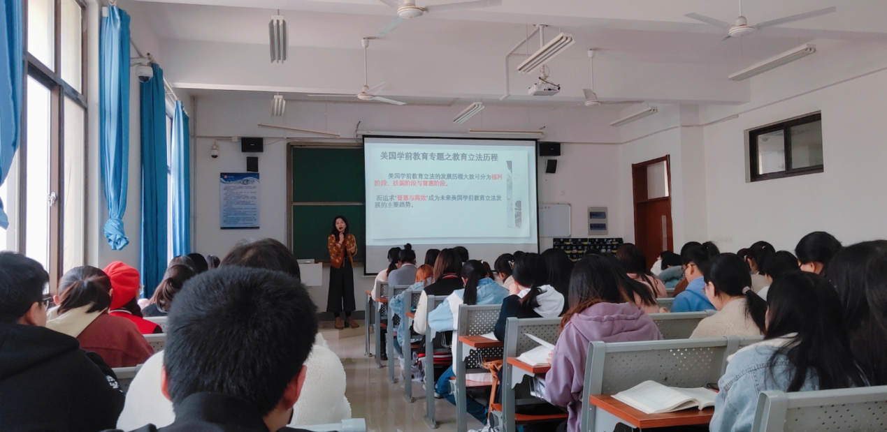 当天,刘冠男执教《学前比较教育》,教学对象为2018级学前教育本科班学生。刘冠男从国际性视角出发,带领学生深入解读中美两国学前教育相关政策,从不同的角度剖析中美两国学前教育立法发展过程中出现的问题与挑战,帮助学生厘清思路,更好地理解我国学前教育立法历程,强化专业课程的“课程思政”育人成效。