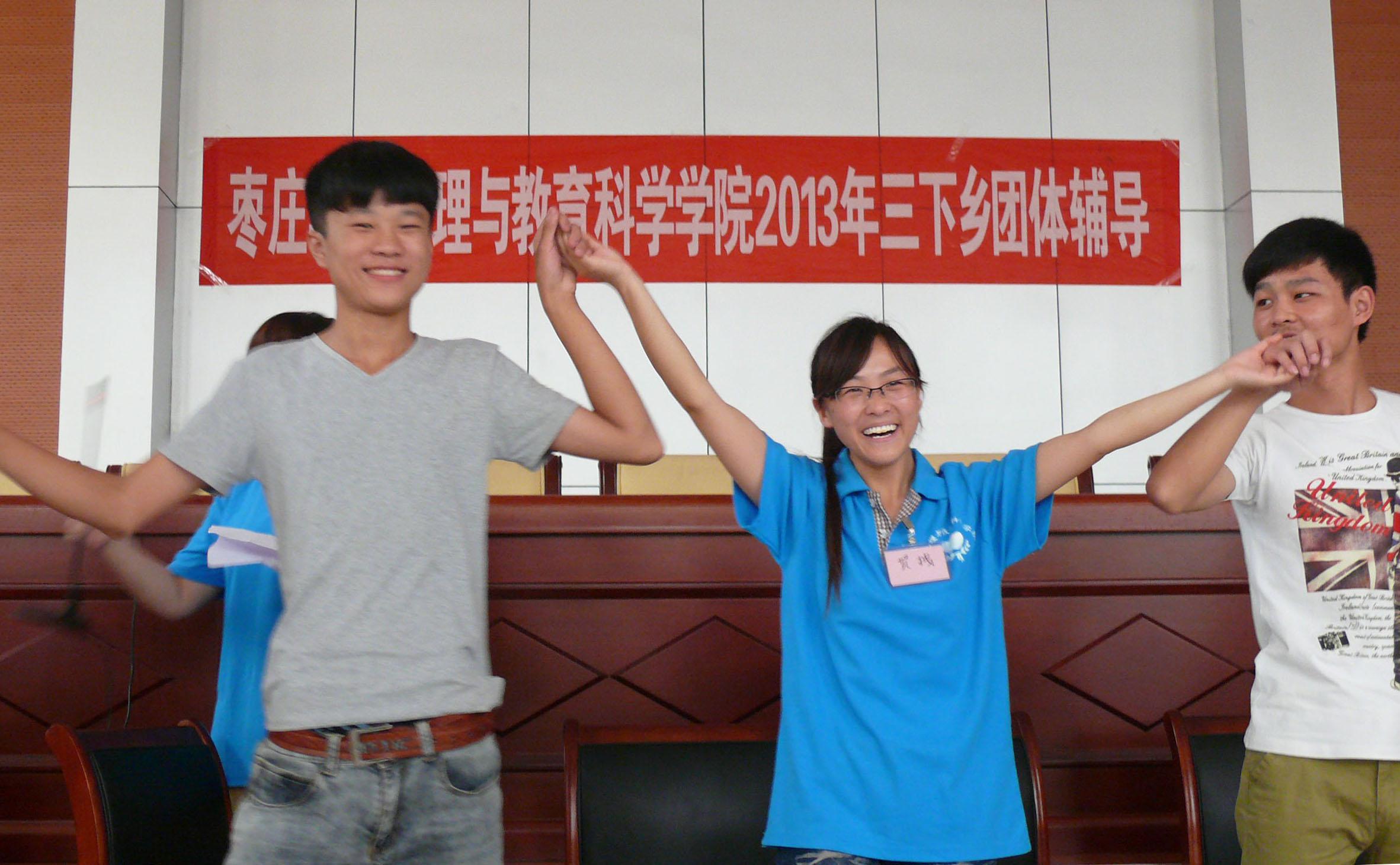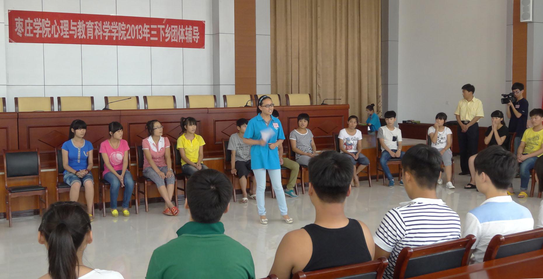 为贯彻落实团中央关于“我的中国梦”教育实践活动,进一步激发广大青年学生成才报国的责任感和积极性,引领广大青年学生在基层实践中成长成材。7月5日下午,由BB贝博艾弗森官方网站组成的枣庄学院大学生暑期“三下乡”社会实践服务队一行20余人,到枣庄第四中学举行“枣庄学院大学生三下乡团体辅导”。参加团体辅导的有我院心理健康教育中心的老师和15名志愿者以及枣庄第四中学师生80余人。