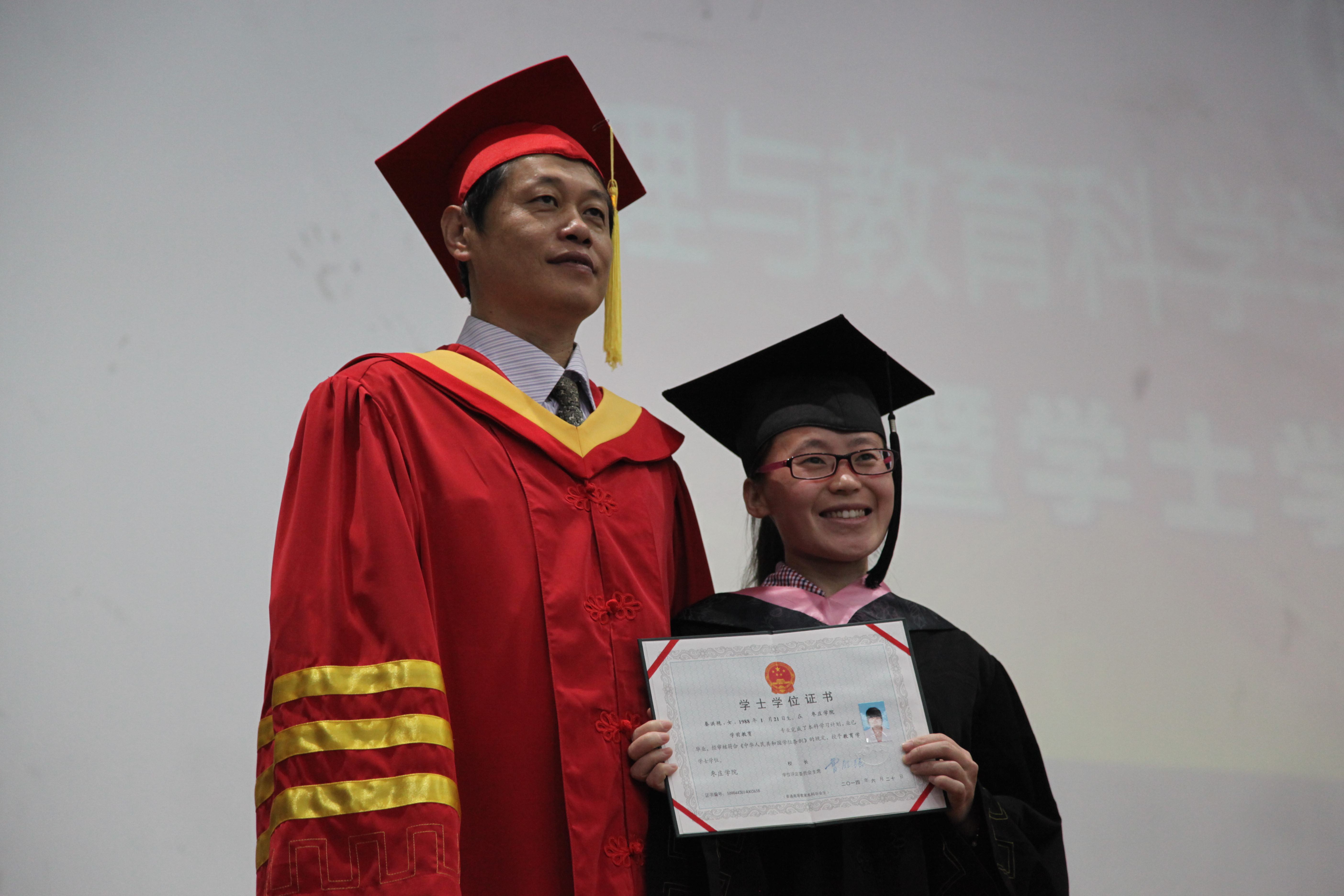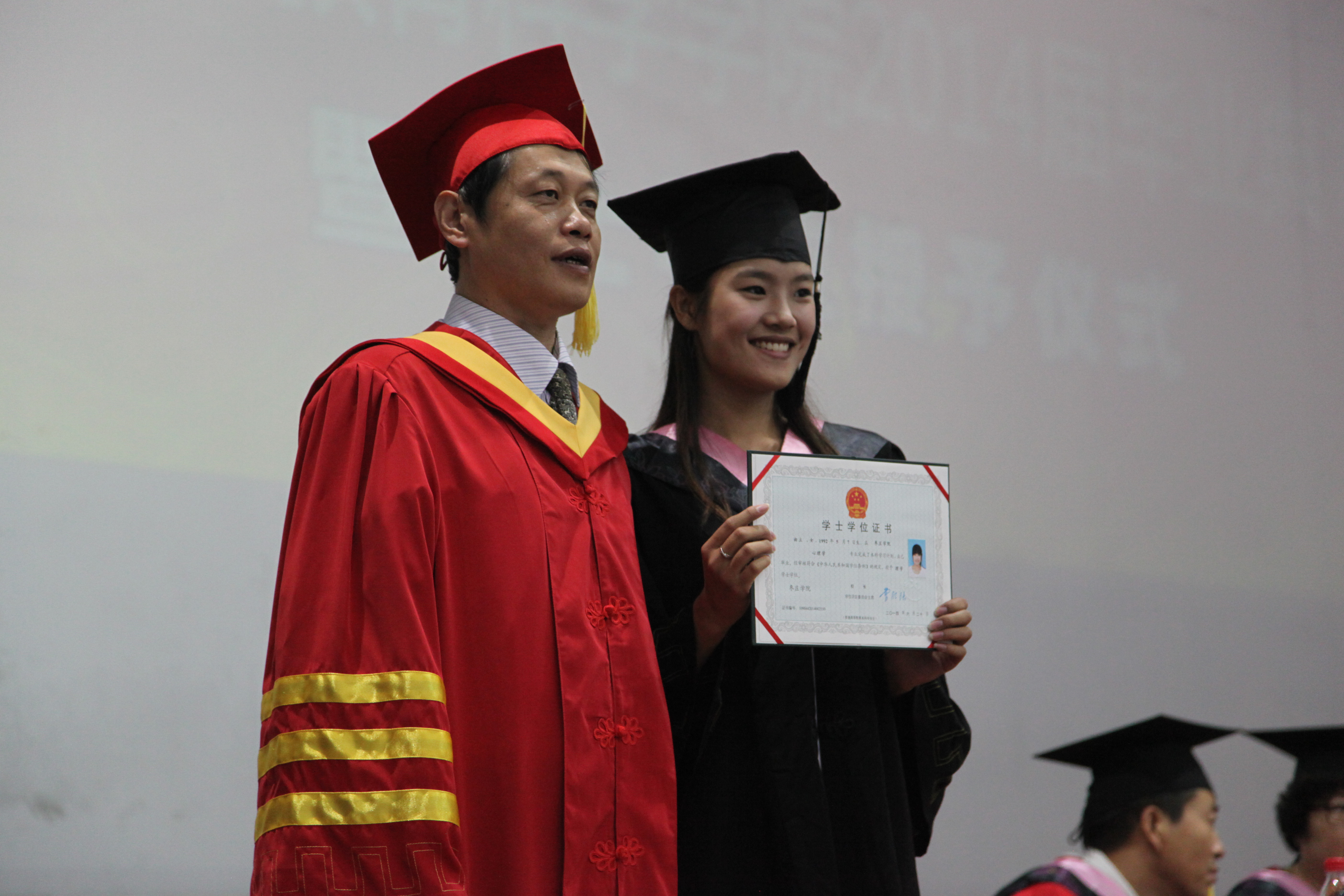 学士学位授予仪式在庄严的国歌声中式开始。 随后,在激扬欢快的《步步高》乐曲声和雷鸣般的掌声中,学士学位获得者依次登台,曾宪明副校长为他们颁发学士学位证书,并为每位学生一一扶正流苏,合影留念。