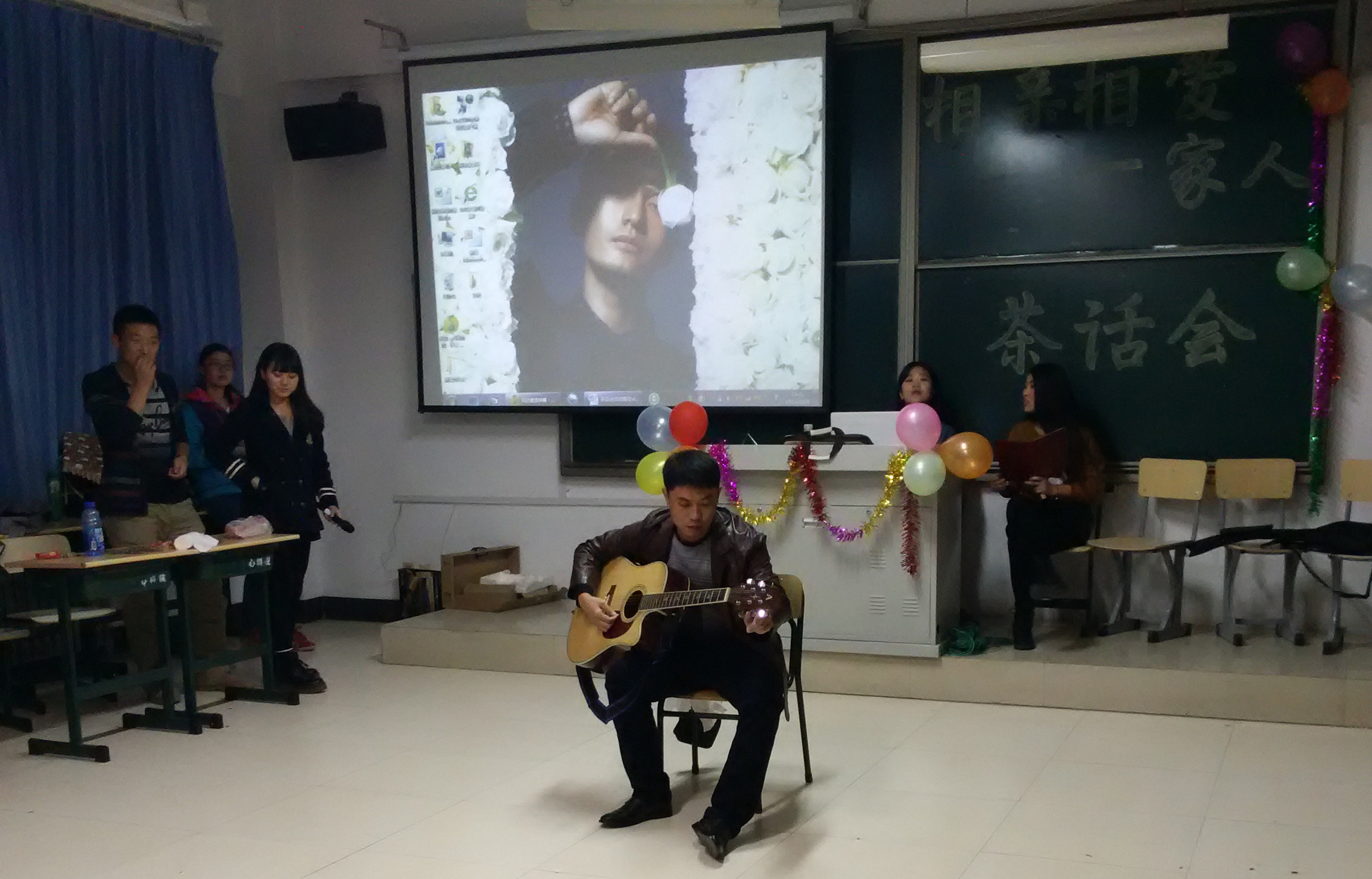 在色彩缤纷、洋溢着浪漫与温馨的教室里,茶话会正式开始。首先,主持人通过ppt形式展示了学生会各部成员的生活照,让我们了解了各成员可爱率真的一面,展现了他们不一样的风采。接着,由文艺部同学表演的热情奔放的舞蹈,迅速带动了全场活跃的氛围。随后,各部门积极展示自己的才艺。热情激昂的演唱,不断博得台下热烈的掌声;幽默诙谐的小品,赢得观众们的阵阵喝彩;笑料百出的双簧,逗得大家哄堂大笑。还有由团总支负责人孙兴老师深情演唱的歌曲,更是精彩绝伦,得到大家的一致好评。整个现场欢声笑语,热闹非凡。最后,在大家的意犹未尽中,此次茶话会圆满结束。