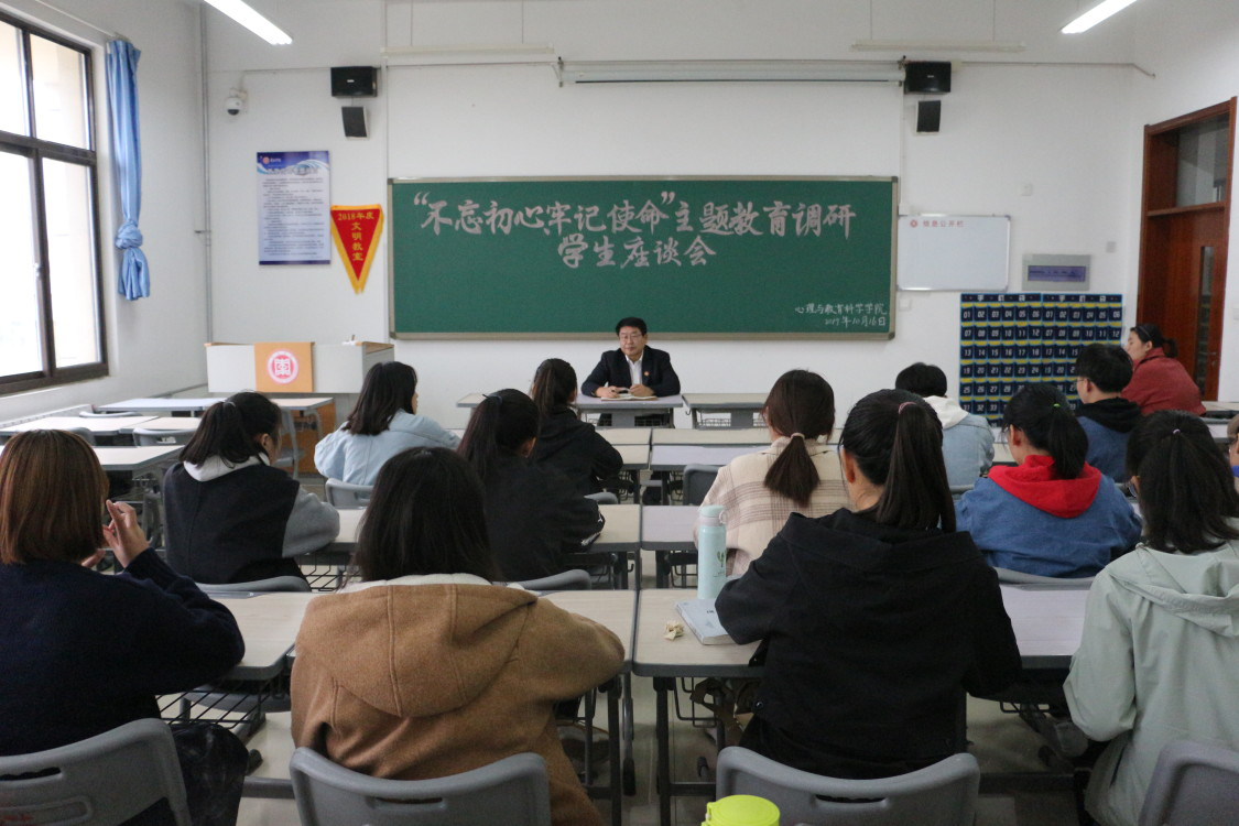 10月16日,我院于教师教育楼312室举行“不忘初心、牢记使命”主题教育蹲班调研学生座谈会。学院党总支书记赵荣军出席,2018级小学教育1班师生共三十余人参会。