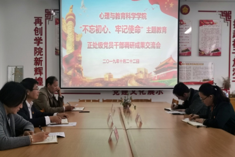 10月22日,我院在教师教育楼215室召开“不忘初心、牢记使命”主题教育正处级党员干部调研成果交流会。学校第三巡回指导组副组长华莹、成员张轶到会指导。院党总支书记赵荣军、院长傅金兰、党总支副书记宋明峰及各党支部书记参加了交流会,会议由赵荣军主持。
