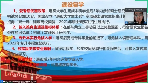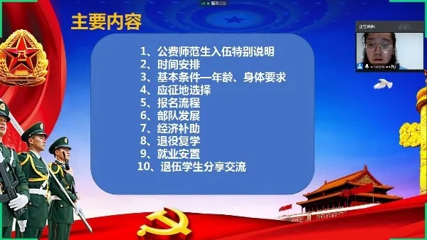 会上,张丽嫱为同学们播放了抖音“中国军网”的短视频,体现军人的卓越气质,活跃了会议气氛。接着,从公费师范生入伍、入伍报名流程和基本条件等九个方面做了详细的介绍。其中,重点介绍部队发展、经济补助、退役复学、就业安置四个方面的内容。退役大学生代表孔强,讲述了参军以来的收获,分享了自己通过大学生退役士兵专项通道来参加硕士研究生招生考试并成功录取的经历,鼓励同学们积极投身祖国的国防事业。