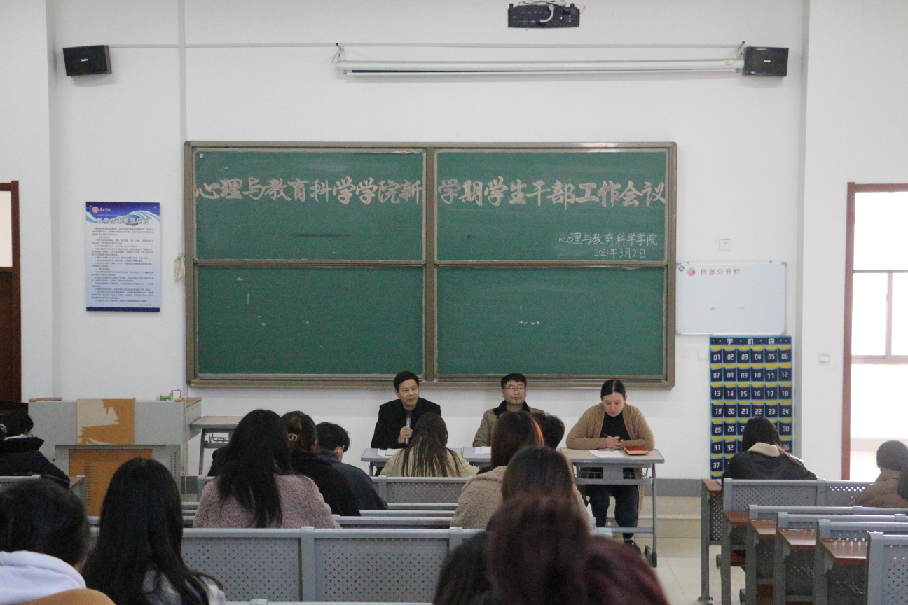 3月2日,BB贝博艾弗森官方网站在教师教育楼216室召开新学期学生干部工作会议。学院党总支书记赵荣军、党总支副书记宋明峰出席,会议由团总支书记张玉洁主持,学生会副部及以上学生干部和各班班长、团支书参加。