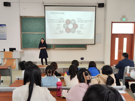 姜雪通过对近几年师范生就业形势的分析,指出通过考研提高学历和能力水平是提升就业水平的重要渠道,也是践行立德树人根本任务的现实需要。随后对考研内容、要求、报考人数等方面数据进行了详实的分析,探讨了在专硕逐步统考的当下,师范生如何选择专业和学校,并分享了专业课高效复习策略。她鼓励同学们志存高远,把自身发展融入国家教育高质量发展的宏伟蓝图,从现在开始矢志奋斗,明确发展目标,努力提升自己,更好的实现成才梦、教育梦。最后,进行了互动交流,姜老师认真细致的解答了同学们提出的问题。她风趣幽默、情真意切的语言赢得了同学们的阵阵掌声。