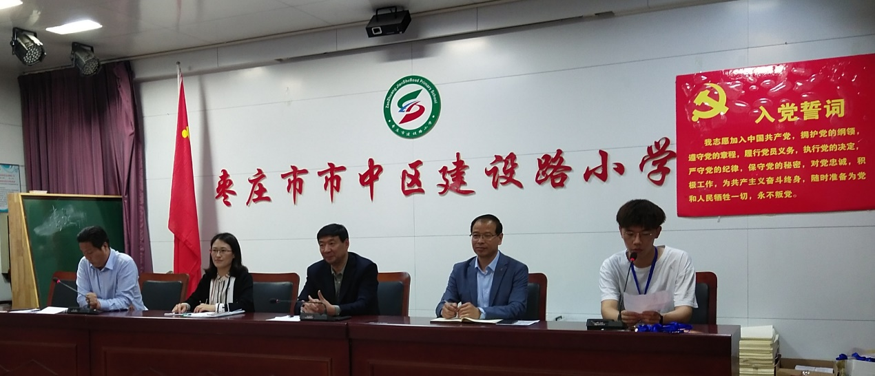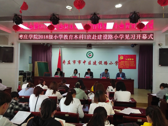 5月10日早上7:30我院师生乘坐公交车到达枣庄市市中区建设路小学(西校),在校门口排队测量体温后,有序进入校园。建设路小学对于我院师生的到来表示热烈欢迎,并为我院师生举办了见习开幕式。种道法校长、王锦彬副校长、胡安峰副校长、孙敏副校长以及小学各指导老师,我院见习带队教师徐愫芬和2018级小学教育本科1班42名见习学生出席本次开幕式。