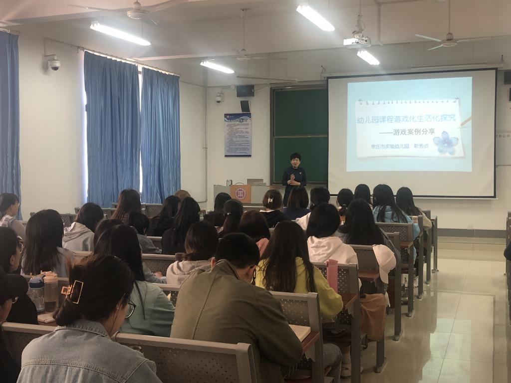 4月10日,靳秀贞园长走进课堂为2018级学前教育本科班学生带来了一堂精彩的关于幼儿园主题教育活动的实践指导课。