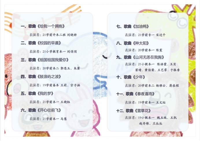为落实学前教育专业“厚基础、重实践、强能力”的培养目标,提高师范生专业技能与素养,丰富学生校园生活,11月17日,我院于教师教育实验楼504室举办了首届师范生歌表演竞赛。