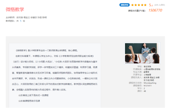 课程于2014年开始建设规划,2016年第一次开课,至今已完成8轮次教学任务。课程获批山东省线上线下混合式一流课程、山东省课程思政示范课,主讲教师成员获得山东省教学名师荣誉称号,获得山东省高校教师教学创新大赛二等奖、三等奖,获得山东省高校青年教师教学竞赛三等奖。