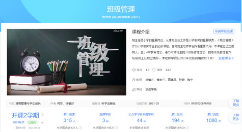 《班级管理》作为小学教育专业的必修课程,在师范生培养中发挥着重要作用,着力提升其班级管理理念,提高其班级管理能力,培育其班主任职业情怀。本课程教学团队教师包括徐愫芬、傅金兰、高建凤、孙逊、陶宇,于2016年第一次开课,至今已完成8轮次教学任务。近年来,本课程已获批山东省高等教育课程思政示范课程、山东省线上线下混合式一流本科课程、山东省继续教育数字化共享课程优质课程,课程负责人获得山东省高校教师教学创新大赛三等奖,主讲教师获得山东省教学名师荣誉称号,获得山东省高校青年教师教学竞赛优秀奖。